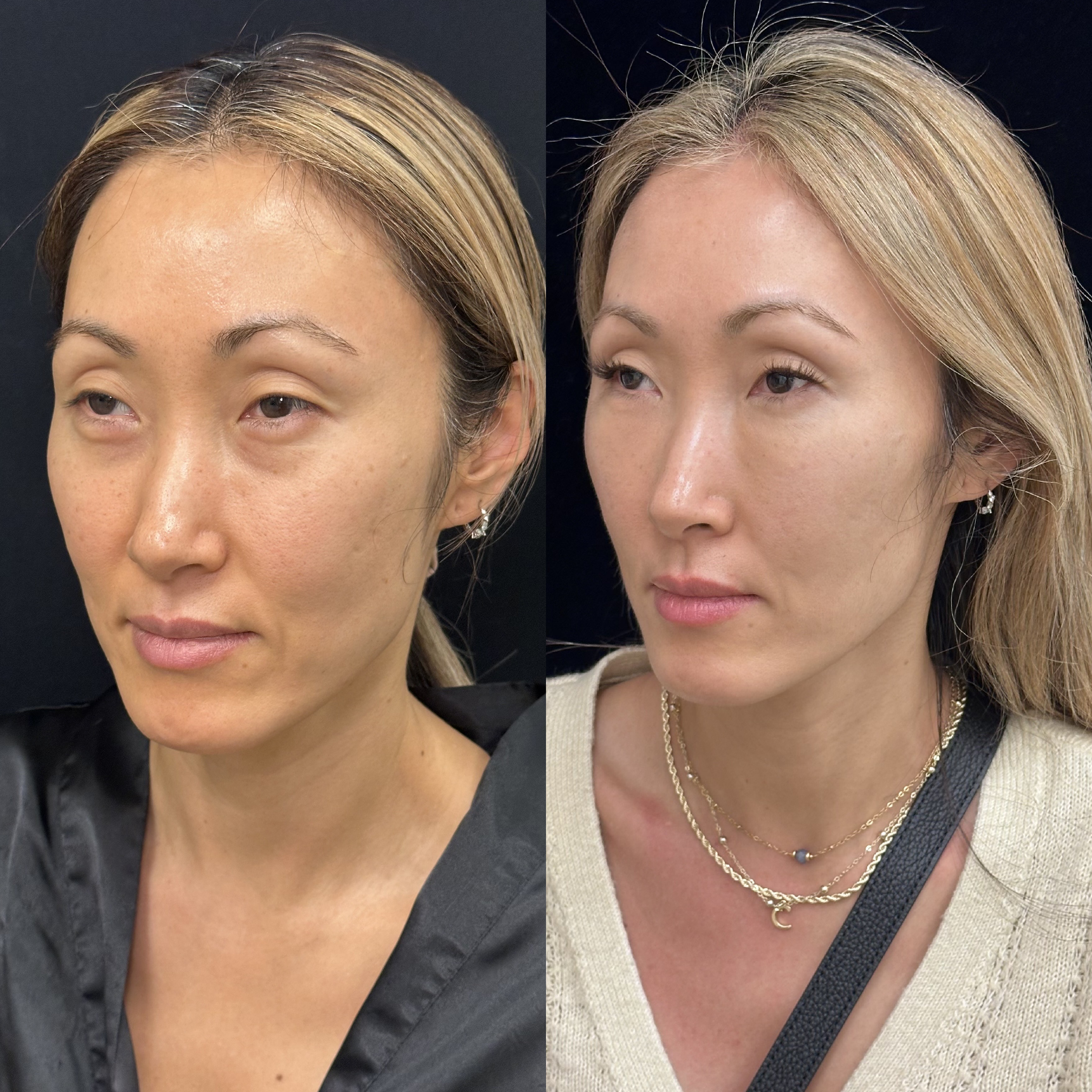 The patient is a 32 y.o female who was always bothered by hollowing of her cheeks. She felt she looked tired even with all the makeup. She was also concerned about eye bags under her lower eyelids. She underwent lower blepharoplasty and facial fat transfer to cheeks and tear tough area under local anesthesia. She had minimal bruising post-op. Post-operatively, her eyebags are gone and her midface is volumized giving her an elegant appearance. She told me that she has received so many compliments at work about her refreshed look.